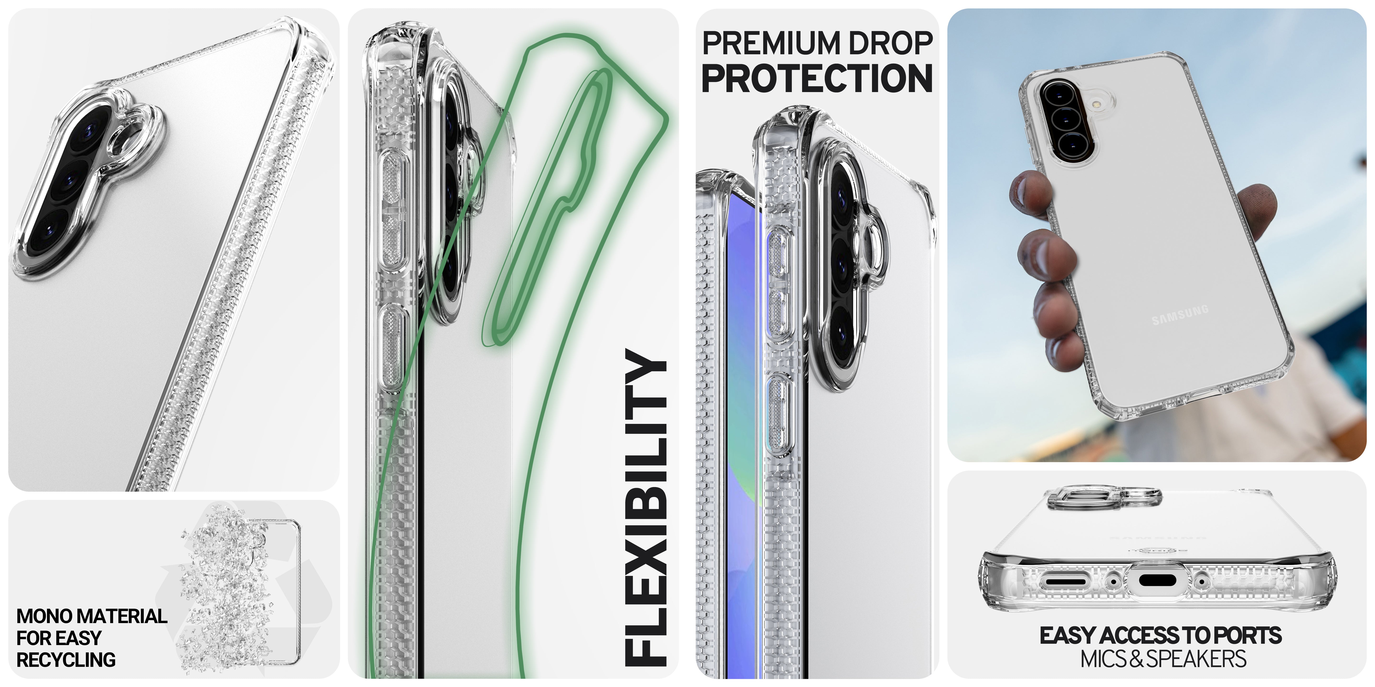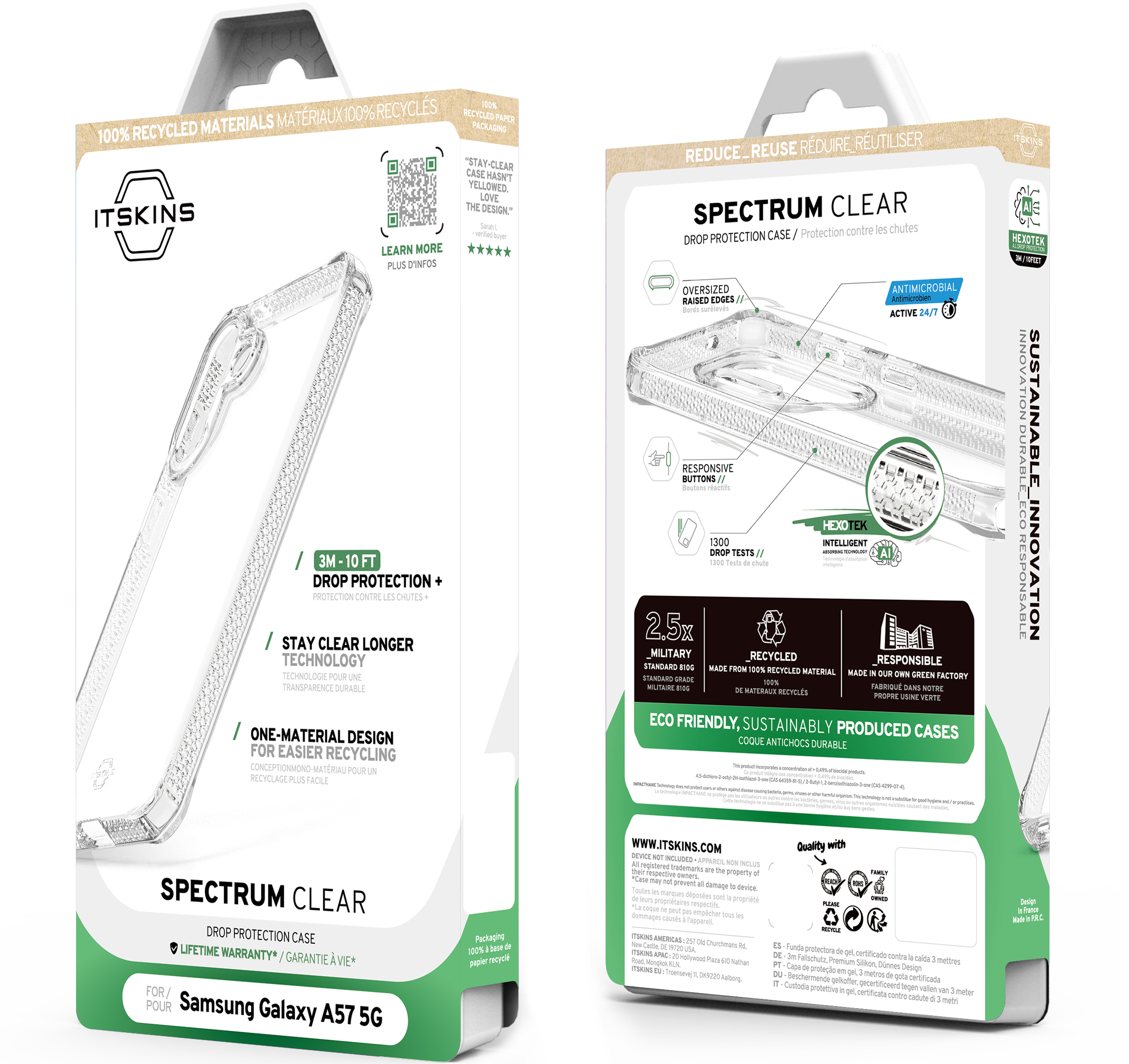 SPECTRUM_R CLEAR : Proprietary True Clear, Certified 100% Recycled, Mono-Material for Simplified Recycling. Offers AI-Enhanced Drop Protection up to 3M / 10FT, Superior Anti-Yellowing, and Antimicrobial Defense.
