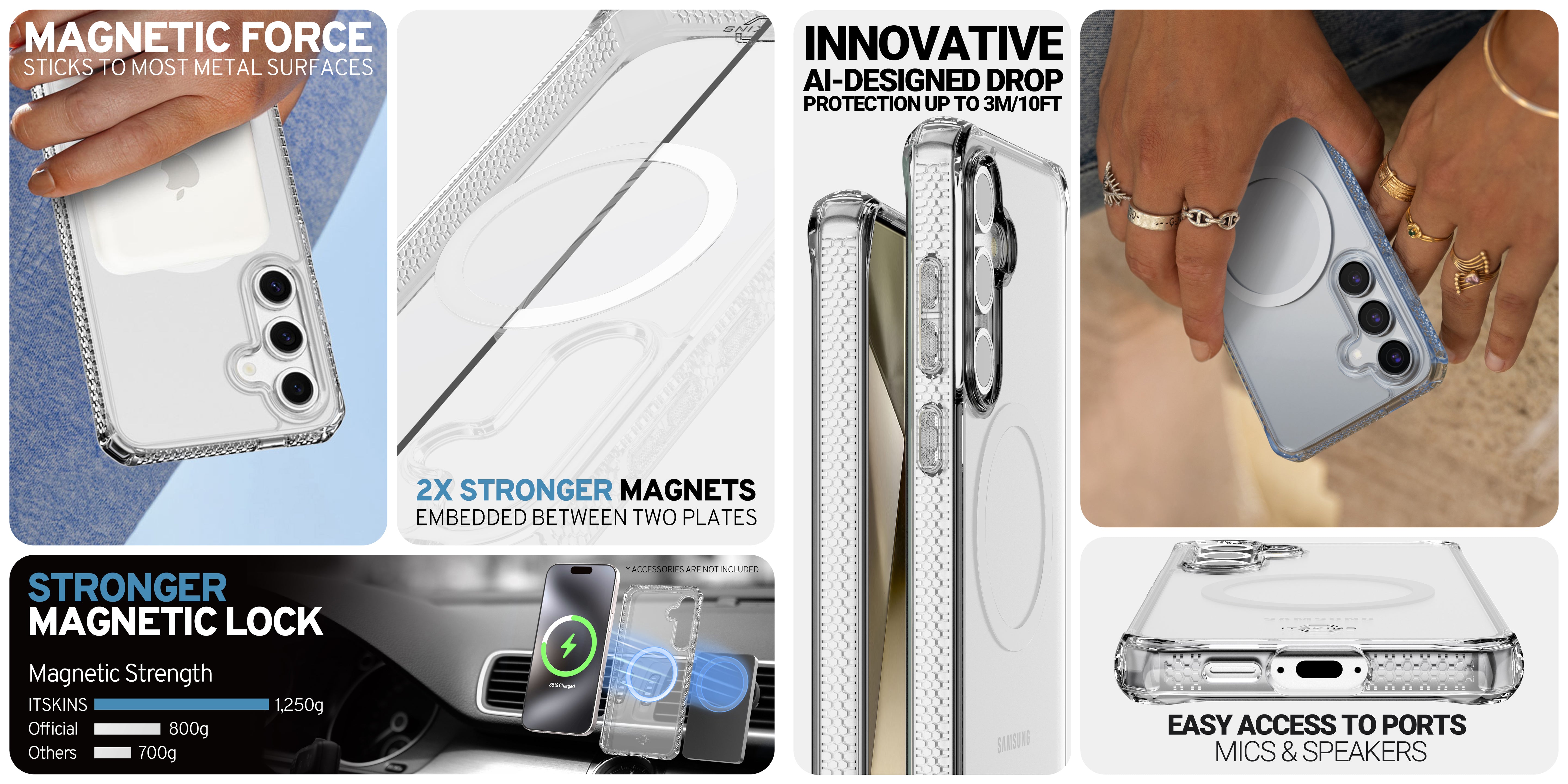 HYBRID_R // CLEAR has built-in magnets and is certified by the Global Recycled Standard for using 100% recyclable materials and produced with sustainably. It delivers premium drop protection and anti-yellowing antimicrobial defense.
