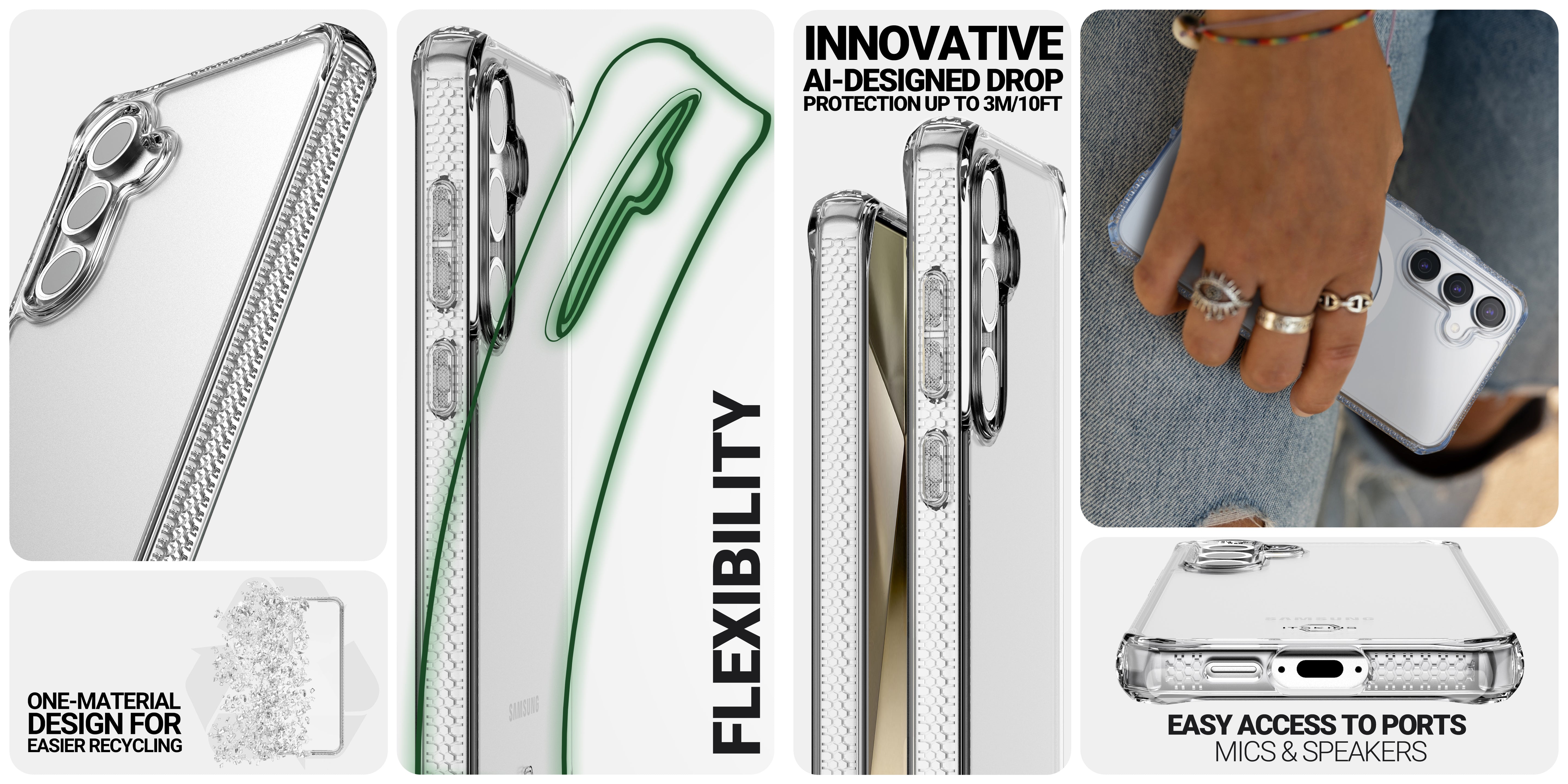SPECTRUM_R CLEAR : Proprietary True Clear, Certified 100% Recycled, Mono-Material for Simplified Recycling. Offers AI-Enhanced Drop Protection up to 3M / 10FT, Superior Anti-Yellowing, and Antimicrobial Defense.