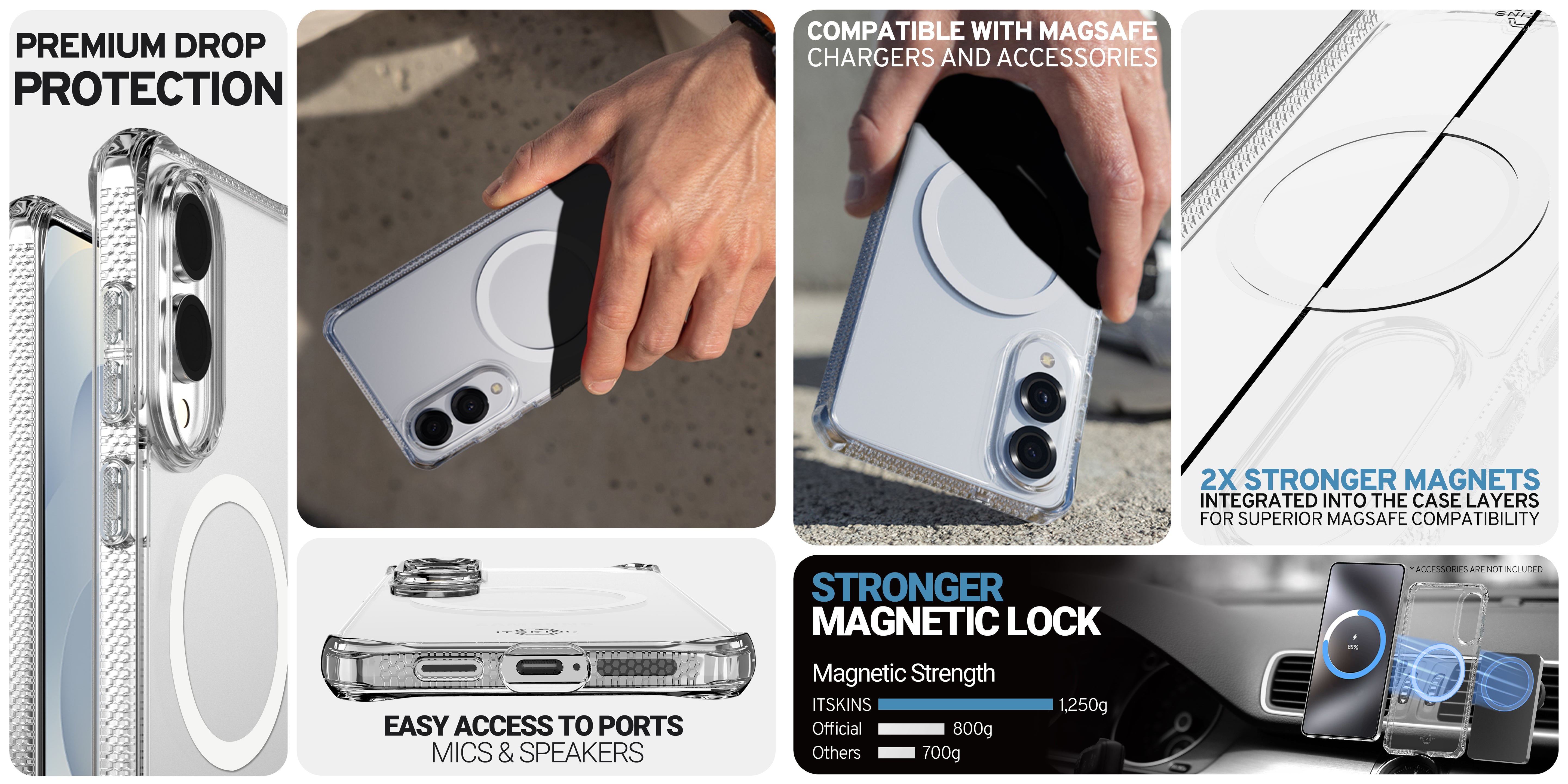 HYBRID_R // CLEAR has built-in magnets and is certified by the Global Recycled Standard for using 100% recyclable materials and produced with sustainably. It delivers premium drop protection and anti-yellowing antimicrobial defense.