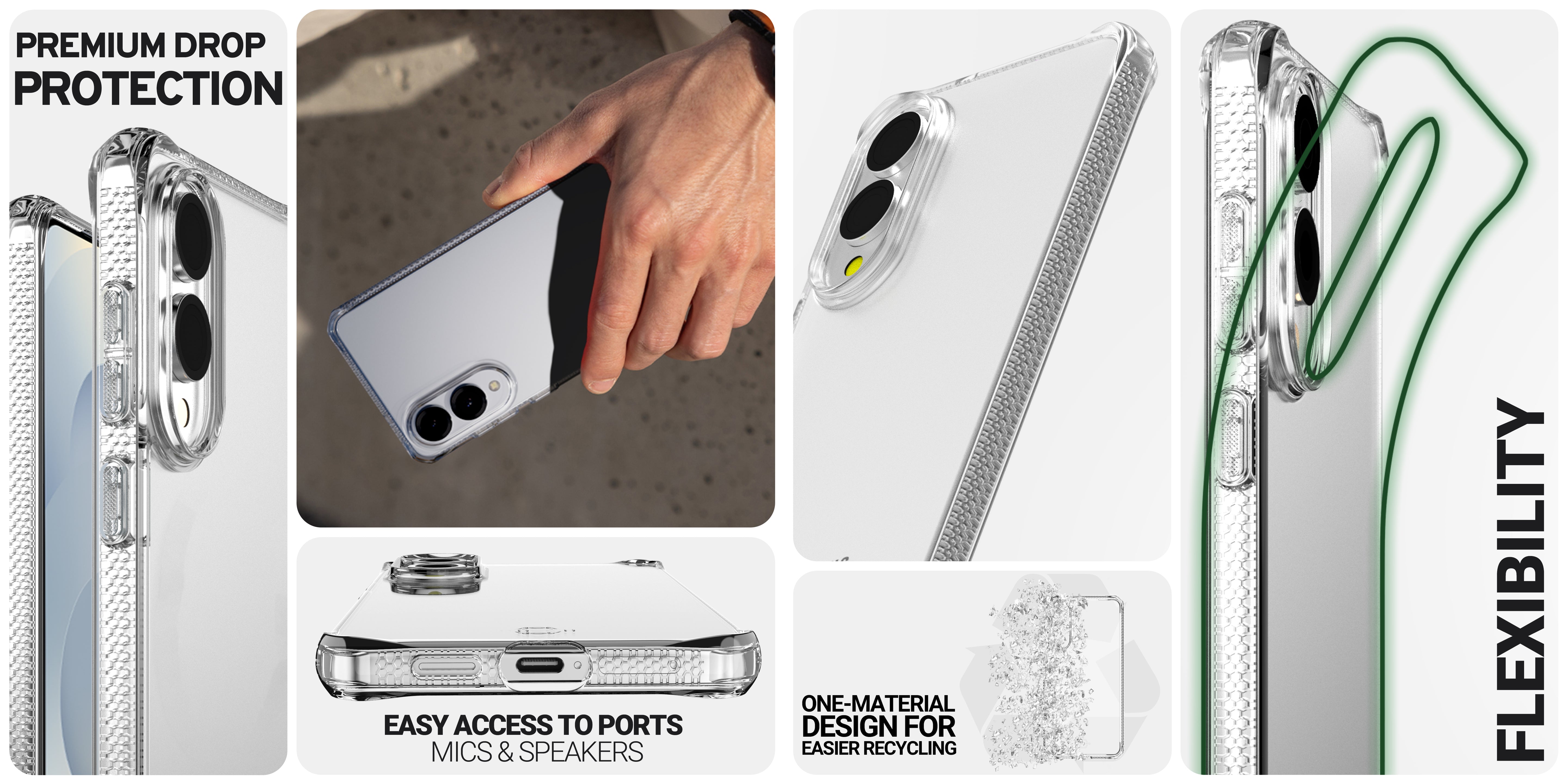 SPECTRUM_R CLEAR : Proprietary True Clear, Certified 100% Recycled, Mono-Material for Simplified Recycling. Offers AI-Enhanced Drop Protection up to 3M / 10FT, Superior Anti-Yellowing, and Antimicrobial Defense.