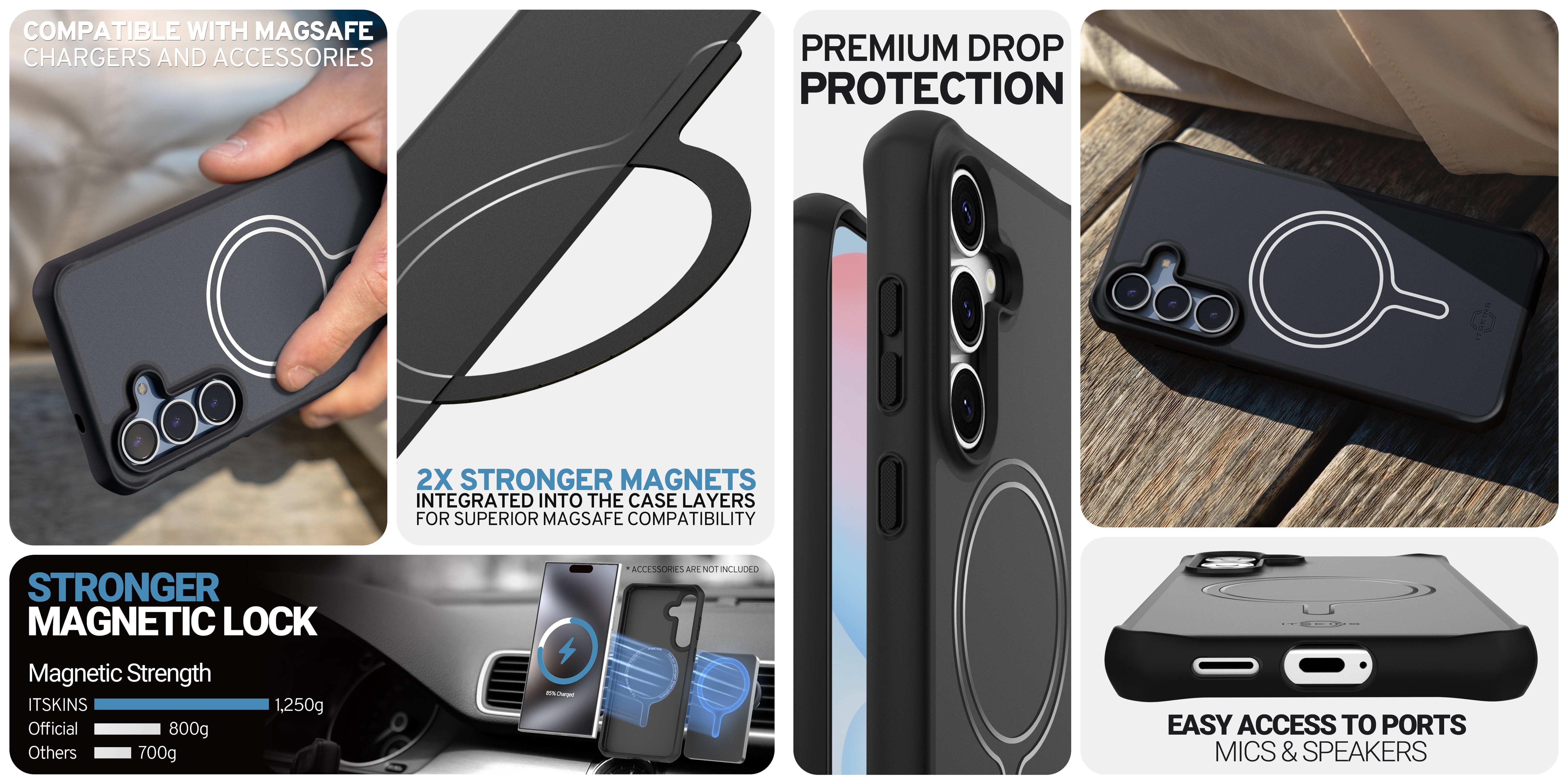 HYBRID R BOLD : features a sleek, blacked-out design with a fingerprint-resistant silk black back and a textured solid bumper for enhanced grip. Its anti-scratch back surface keeps the case looking pristine over time. Integrated with 2X Stronger MagSafe for secure attachment, AI-optimized for up to 3M / 10ft drop protection, and eco-friendly with Global Recycled Standard Certification. Equipped with air-pocket corners, antimicrobial defense, and responsive buttons, it's adventure-ready with a Lifetime Warranty.