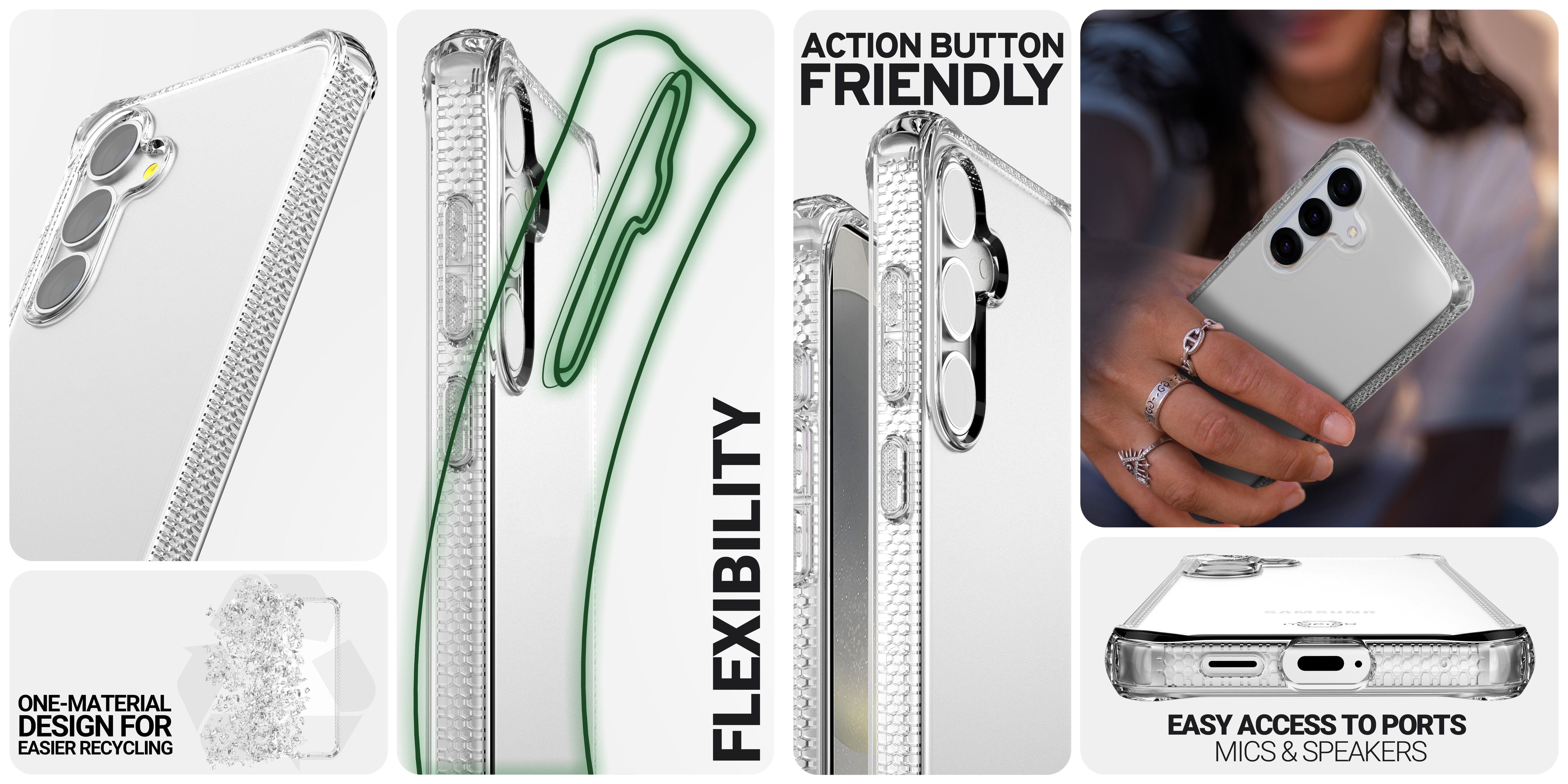 SPECTRUM_R CLEAR : Proprietary True Clear, Certified 100% Recycled, Mono-Material for Simplified Recycling. Offers AI-Enhanced Drop Protection up to 3M / 10FT, Superior Anti-Yellowing, and Antimicrobial Defense