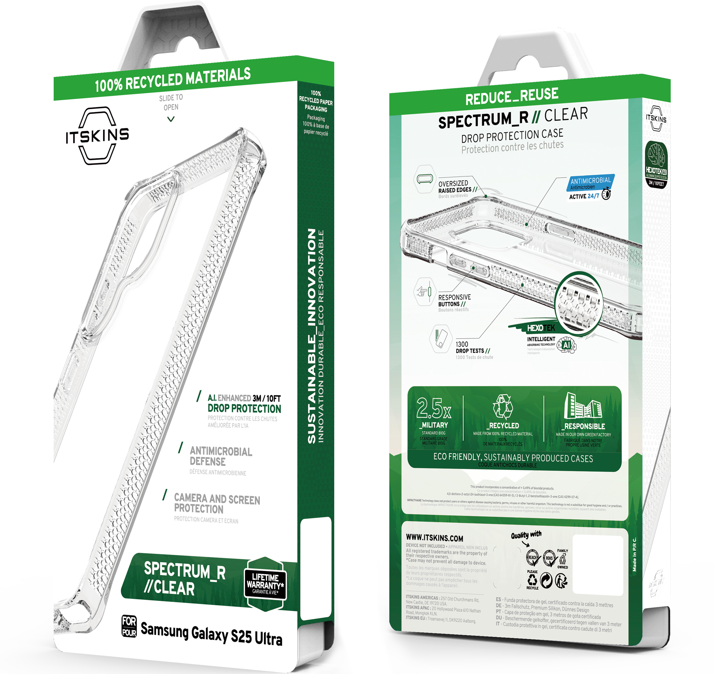 SPECTRUM_R CLEAR : Proprietary True Clear, Certified 100% Recycled, Mono-Material for Simplified Recycling. Offers AI-Enhanced Drop Protection up to 3M / 10FT, Superior Anti-Yellowing, and Antimicrobial Defense.