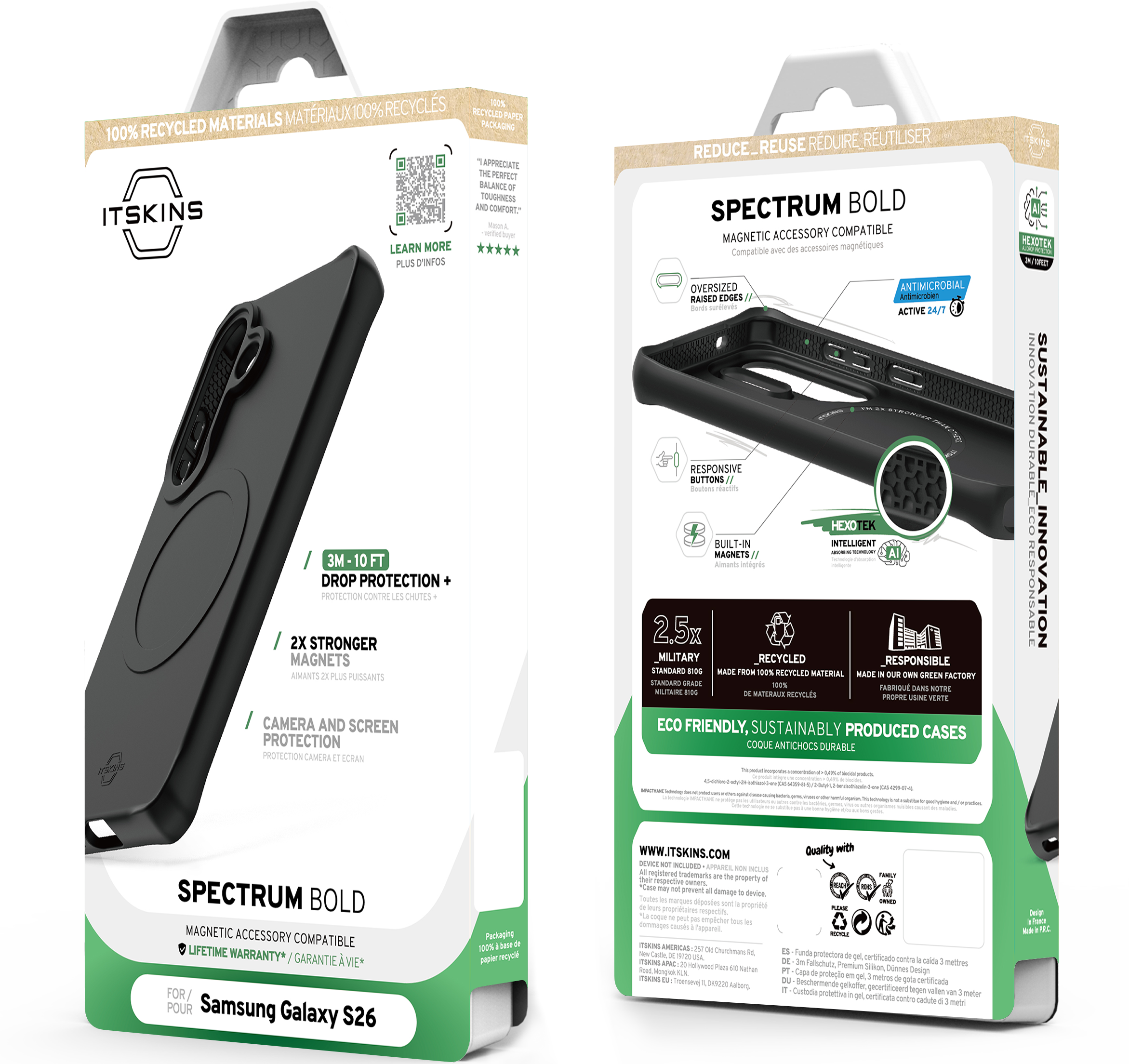 SPECTRUM R // BOLD w/ MagSafe has a silky-soft feel and has been certified by the Global Recycled Standard for using 100% recyclable materials and produced with sustainably. It delivers premium drop protection and antimicrobial defense.