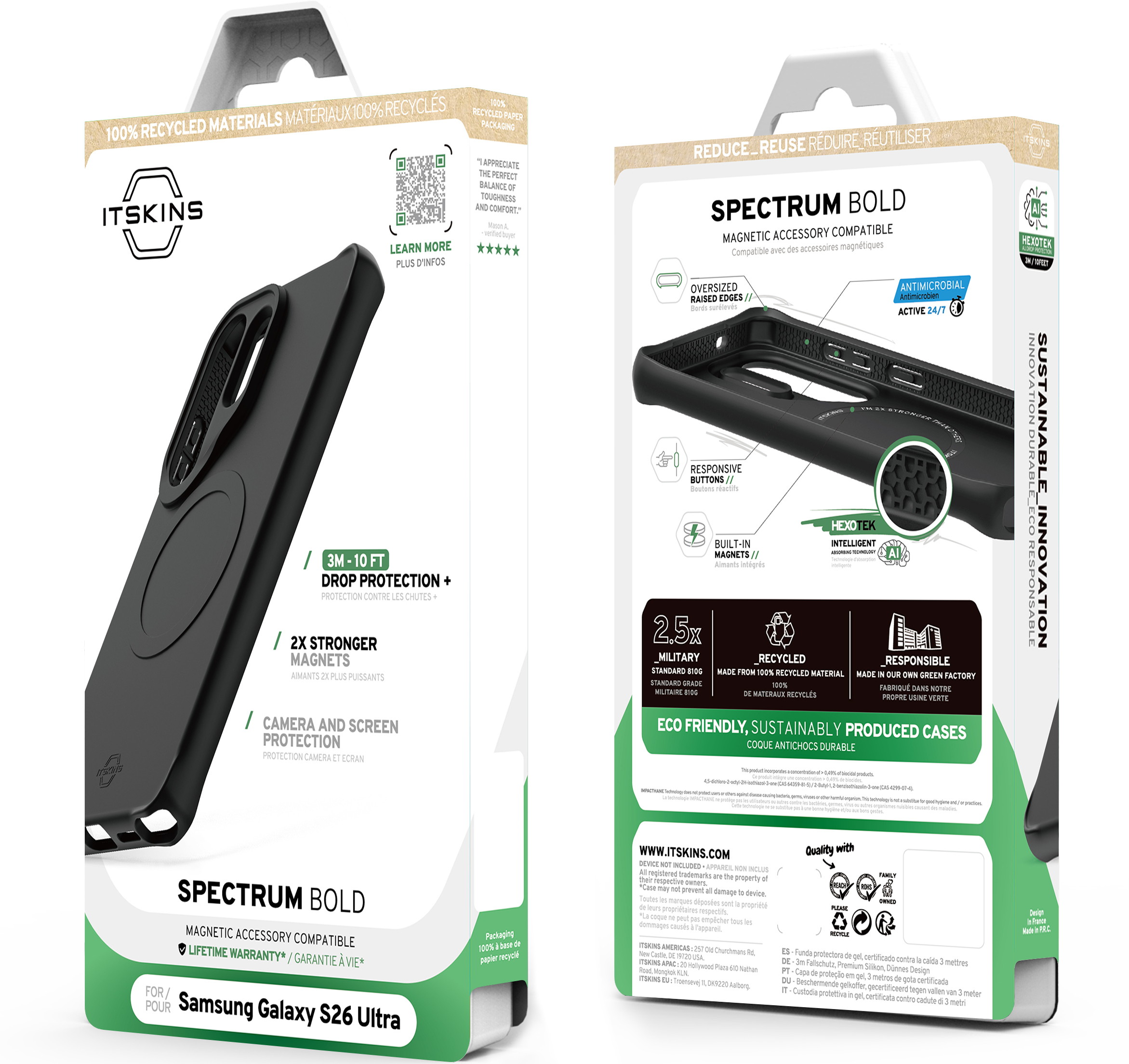 SPECTRUM R // BOLD w/ MagSafe has a silky-soft feel and has been certified by the Global Recycled Standard for using 100% recyclable materials and produced with sustainably. It delivers premium drop protection and antimicrobial defense.