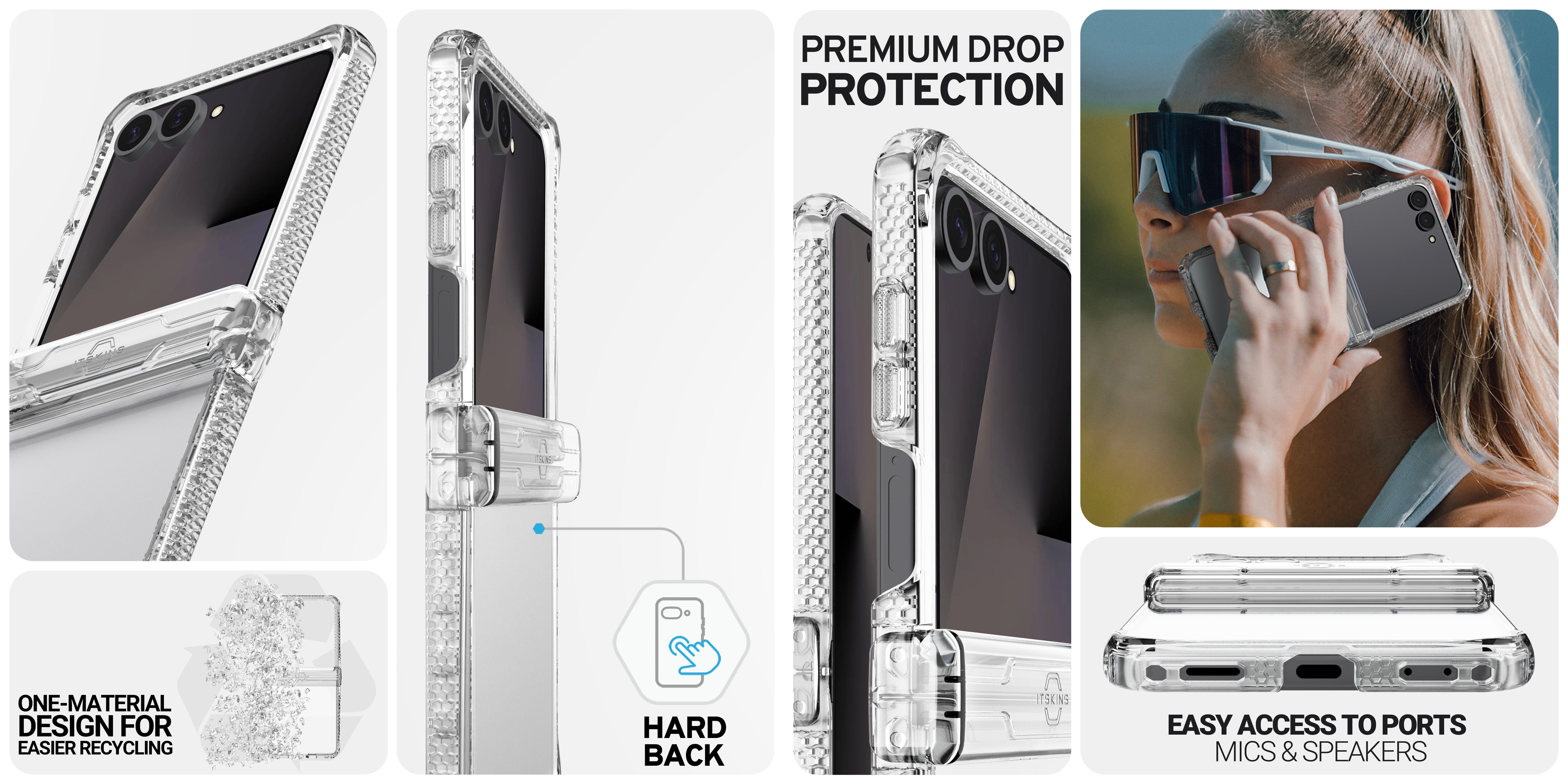 HYBRID_R CLEAR // HINGE Made from recycled materials; this slim, crystal-clear case lets you show off your phone’s premium design. It offers premium drop protection – up to 3M / 10 feet and ensures complete 360 protection of your device with a removable hinge feature. The hinge stays covered, and This also allows you to open and close your phone with either case stays in place with an innovative magnetic system.